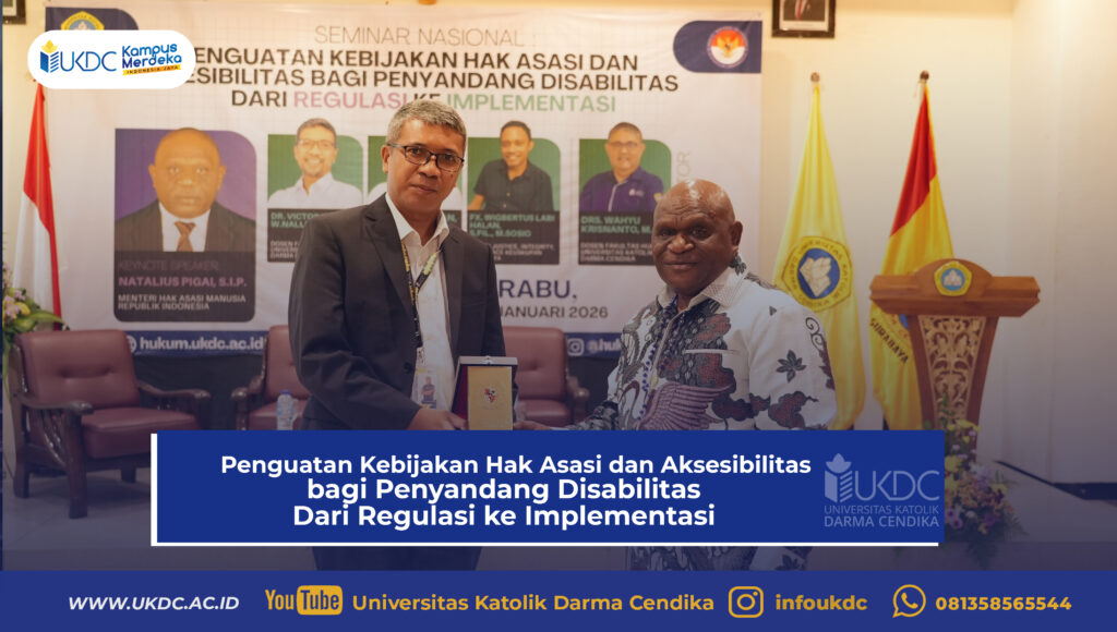 Pusat Studi Inovasi Hukum dan Keadilan Sosial Fakultas Hukum Universitas Katolik Darma Cendika bekerjasama dengan Komisi Nasional Disabilitas mengadakan Seminar Nasional dengan Tema “Penguatan Kebijakan Hak Asasi dan Aksesibilitas bagi Penyandang Disabilitas: Dari Regulasi ke Implementasi”, diselenggarakan pada Rabu, 14 Januari 2026 di Seminar Timur Vidya Loka Lt. 3 Universitas Katolik Darma Cendika. Menghadirikan Menteri Hak Asasi Manusia Natalius Pigai, S.I.P dan narasumber-narasumber berpengalaman dibidangnya, antara lain Dr. Victor Imanuel W.Nalle, S.H., M.H Dosen Fakultas Hukum Universitas Katolik Darma Cendika, Kikin Tarigan Komisioner Komisi Nasional Disabilitas dan FX. Wigbertus Labi Halan, S.Fil., M.Sosio Koordinator Komisi Justice, Integrity, and Peace Keuskupan Surabaya dan di Moderatori oleh Drs. Wahyu Krisnanto, M.A Dosen Fakultas Hukum Universitas Katolik Darma Cendika.