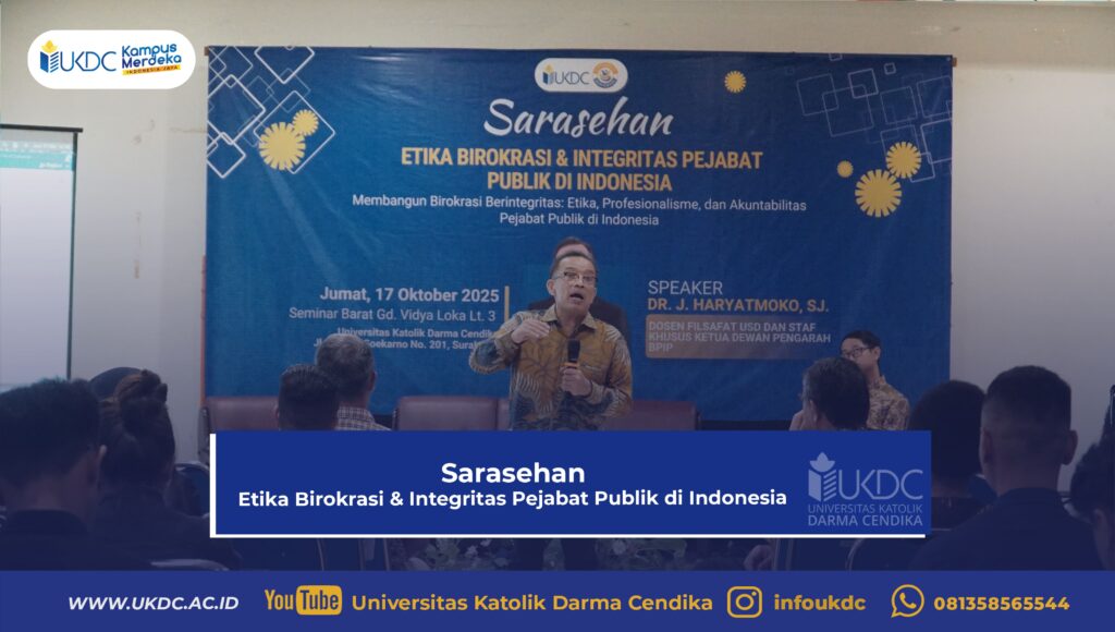 Lembaga Penguatan Nilai Universitas (LPNU) Universitas Katolik Darma Cendika telah mempersembahkan kegiatan Sarasehan Etika Birokrasi & Integritas Pejabat Publik di Indonesia. Acara ini mengusung tema utama “Membangun Birokrasi Berintegritas: Etika, Profesionalisme, dan Akuntabilitas Pejabat Publik di Indonesia”. Sarasehan ini dirancang sebagai platform krusial untuk mendalami berbagai tantangan etika yang dihadapi oleh birokrasi di Indonesia saat ini. Lebih dari itu, kegiatan ini berupaya secara aktif untuk memperkuat profesionalisme di kalangan aparatur publik, serta menumbuhkan kesadaran yang mendalam akan betapa pentingnya integritas dalam mewujudkan tata kelola pemerintahan yang tidak hanya bersih, tetapi juga berkeadilan bagi seluruh lapisan masyarakat.