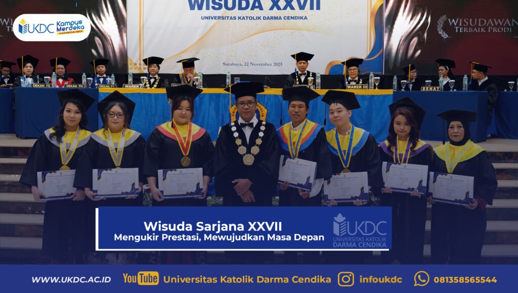 Sebanyak 142 mahasiswa Universitas Katolik Darma Cendika resmi dikukuhkan sebagai sarjana dalam Wisuda Sarjana XXVII yang diselenggarakan pada Sabtu, 22 November 2025, bertempat di Gedung Vidya Loka Lantai 2 UKDC. Prosesi wisuda ini menjadi momentum bersejarah bagi para lulusan dari berbagai program studi, antara lain 40 wisudawan Program Studi Akuntansi, 56 wisudawan Program Studi Manajemen, 12 wisudawan Program Studi Ilmu Hukum, 14 wisudawan Program Studi Arsitektur, 4 wisudawan Program Studi Teknik Industri, 11 wisudawan Program Studi Ilmu Informatika, serta 5 wisudawan Program Studi Akupuntur dan Pengobatan Herbal.